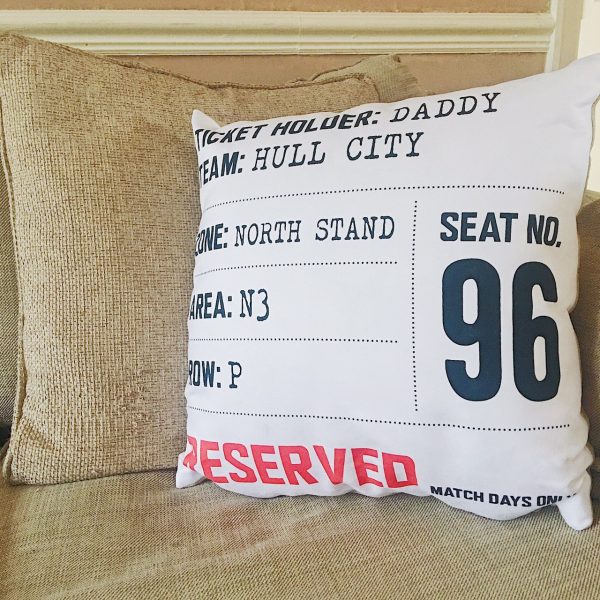 Lastly, but certainly not least, is this fabulous cushion from The Drifting Bear that I chose from Edith. Adam has been a season ticket holder for Hull City for most of his life and before that he would go all the time with friends and family members. I love this cushion because it has the details of his ticket on there and can be personalised for any football fan, Daddy or not.