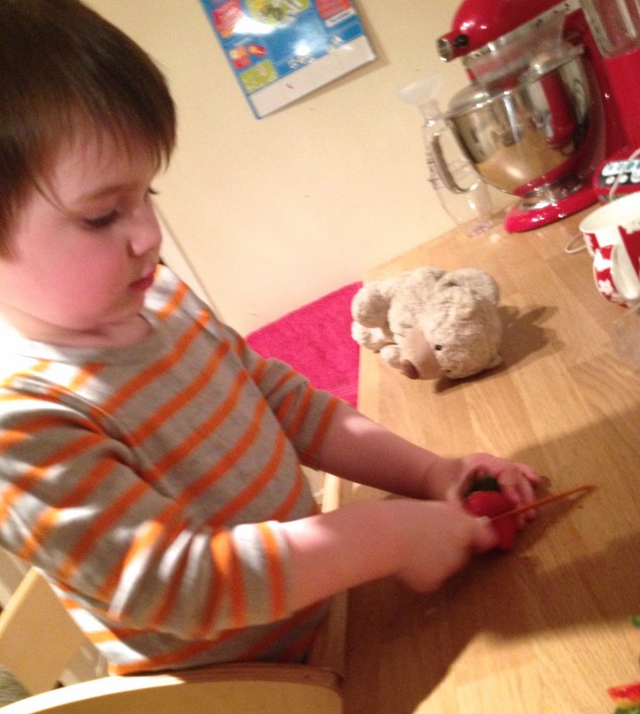 Lately I have been teaching Reuben about knives and knife safety in the kitchen, but despite explaining to him how to hold a knife properly (never to touch the silver/steel part, always hold the handle etc etc etc), I still can’t bring myself to let him chop things while I stand back and supervise. I am always holding his hands, with my finger underneath his to act as an extra barrier before the steel of the knife… which is a shame as I’m pretty sure he could do it alone, its just not worth (or responsible parenting!) to risk it!