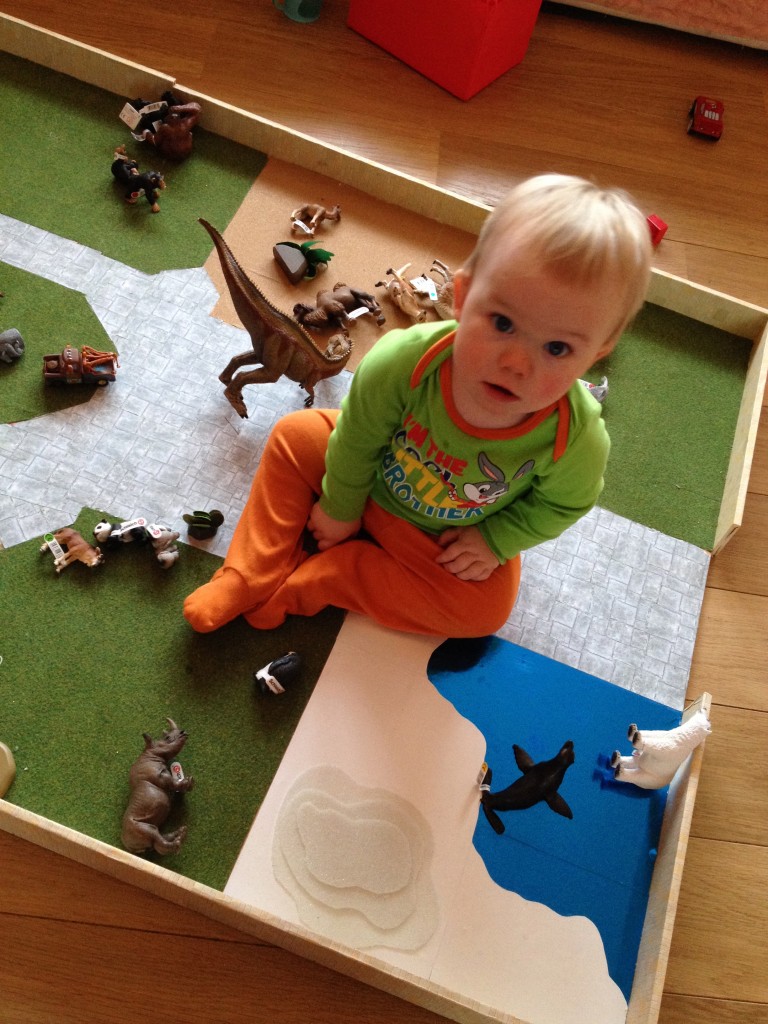 I designed a ‘zoo’ theme with various pens. I used reflective blue paper for water, sand paper for sand (very fine so as not to scratch the children when they play) and model railway grass sheets for the grass pens.