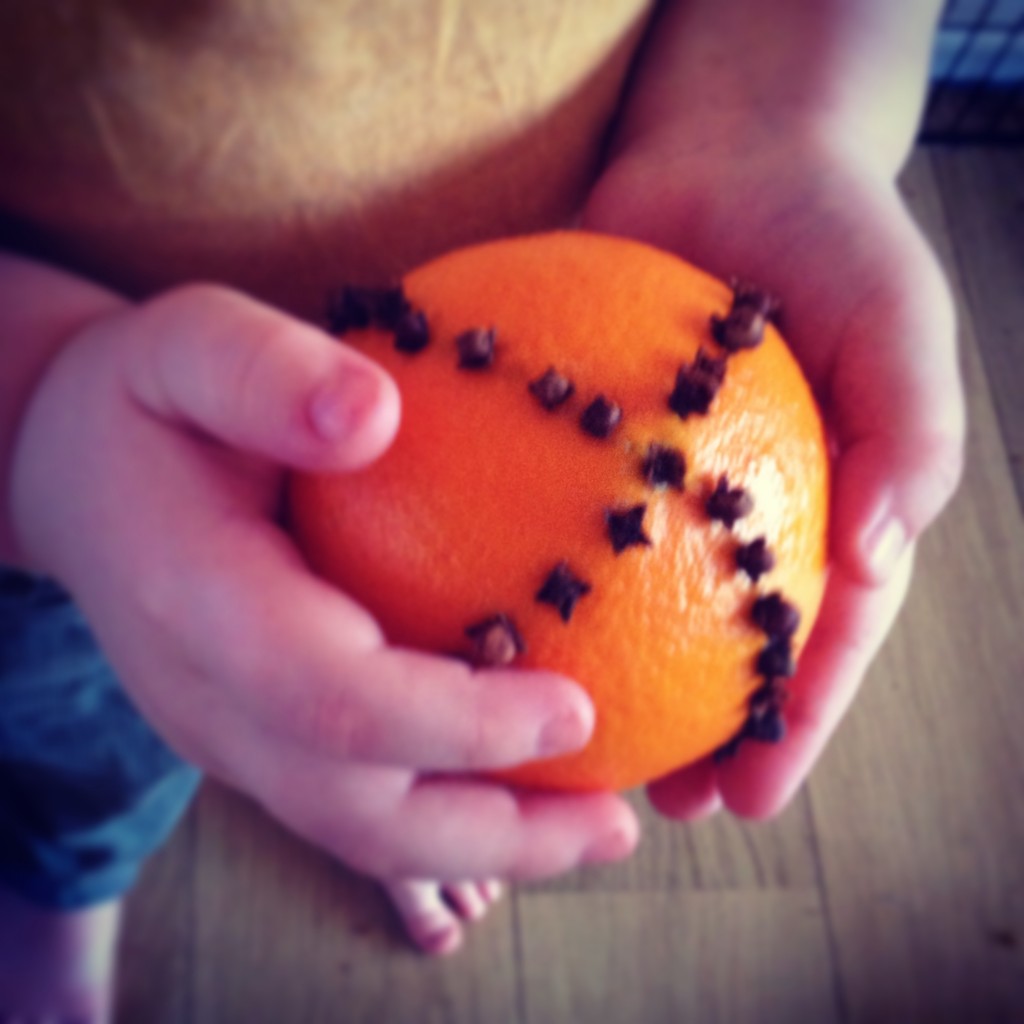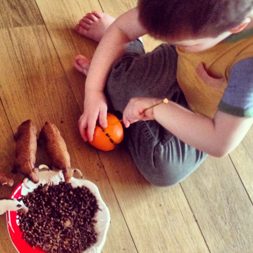 Reuben was sat with a knitting needle (heavily supervised I might add) poking little holes into his orange and then slotting cloves into the holes. He was having a blast and really concentrating on make these wonderful little things. It was great to see him and my Mum doing something together that I loved so much as a child, and of course they were making one for me so I now have a wonderful smelling bedroom and office!