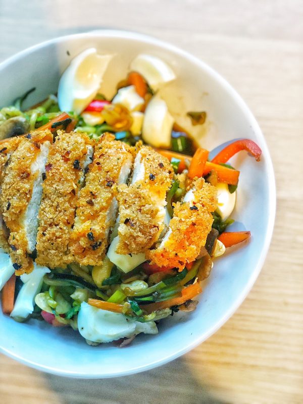 Place the rest of the veggies, garlic, chillies, honey and soy in the wok and stir fry for a few minutes then add back in the courgette. Serve with the chicken on top, sprinkle over the nuts and egg and eat!